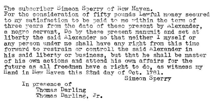 Simeon_Sperry_frees_servant_Oct_1781